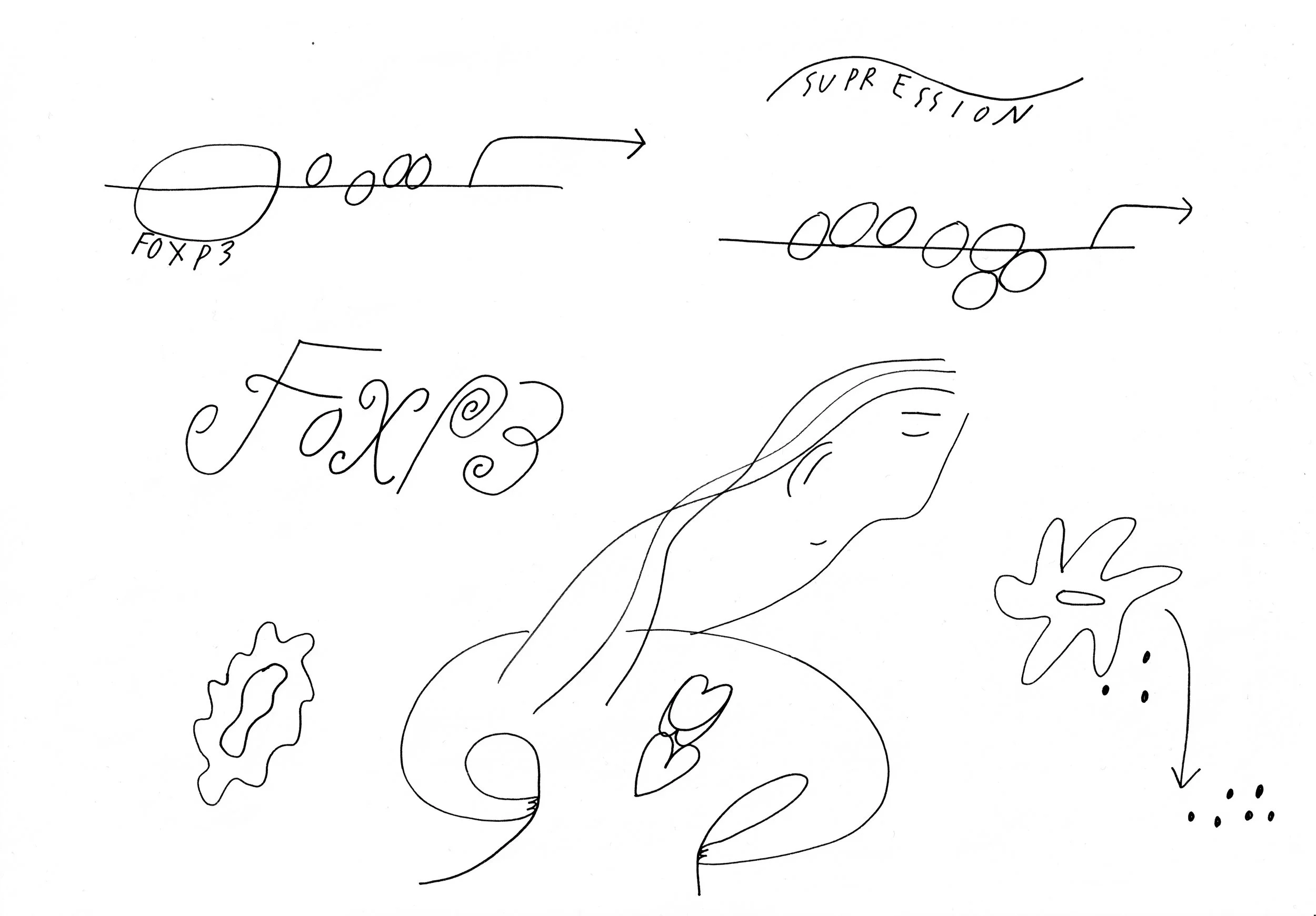 Sketches from ongoing project about the discoveries relating to regulatory T-cells and the FOXP3 gene (in which Mary Brunkow, Fred Ramsdell and Shimon Sakaguchi were awarded the Nobel Prize in Physiology or Medicine 2025).